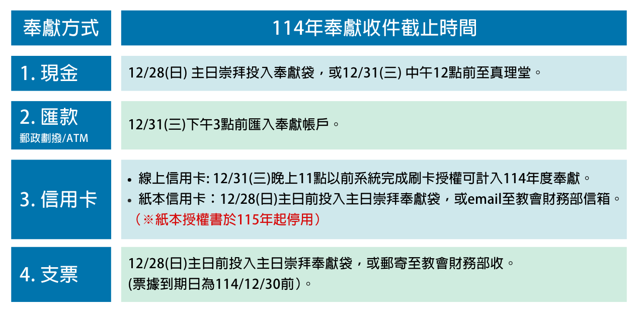 如欲將奉獻計入114年度之弟兄姊妹,請依奉獻收件截止時間完成奉獻,教會奉獻查詢系統提供您今年度捐款徵信記錄。如有任何奉獻相關問題歡迎電洽財務部 (分機135、141) 。 奉獻徵信查詢系統