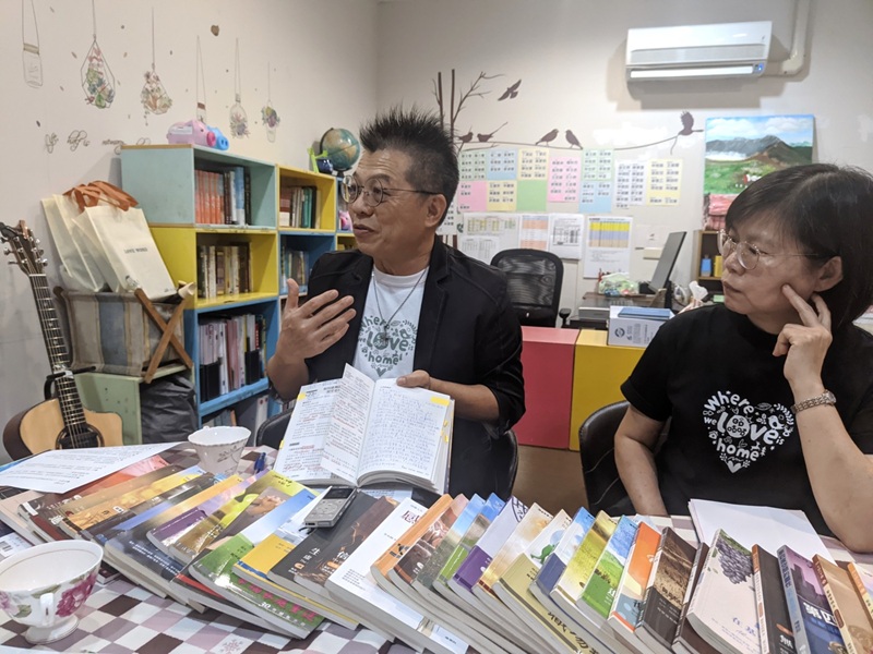 ▲「晨禱咕咕咕」三年多來所使用的靈修禱告材料全部陳列在桌上,兩位牧者夫婦一一細數上帝一路帶領的恩典,開心地分享晨禱如何成為他們教會美好的產業。