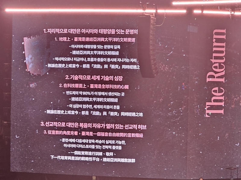 ▲特會信息中提到台灣在亞洲與宣教上的重要角色,牧師邀請全場會眾同心為台灣禱告祝福,期待耶穌再臨。