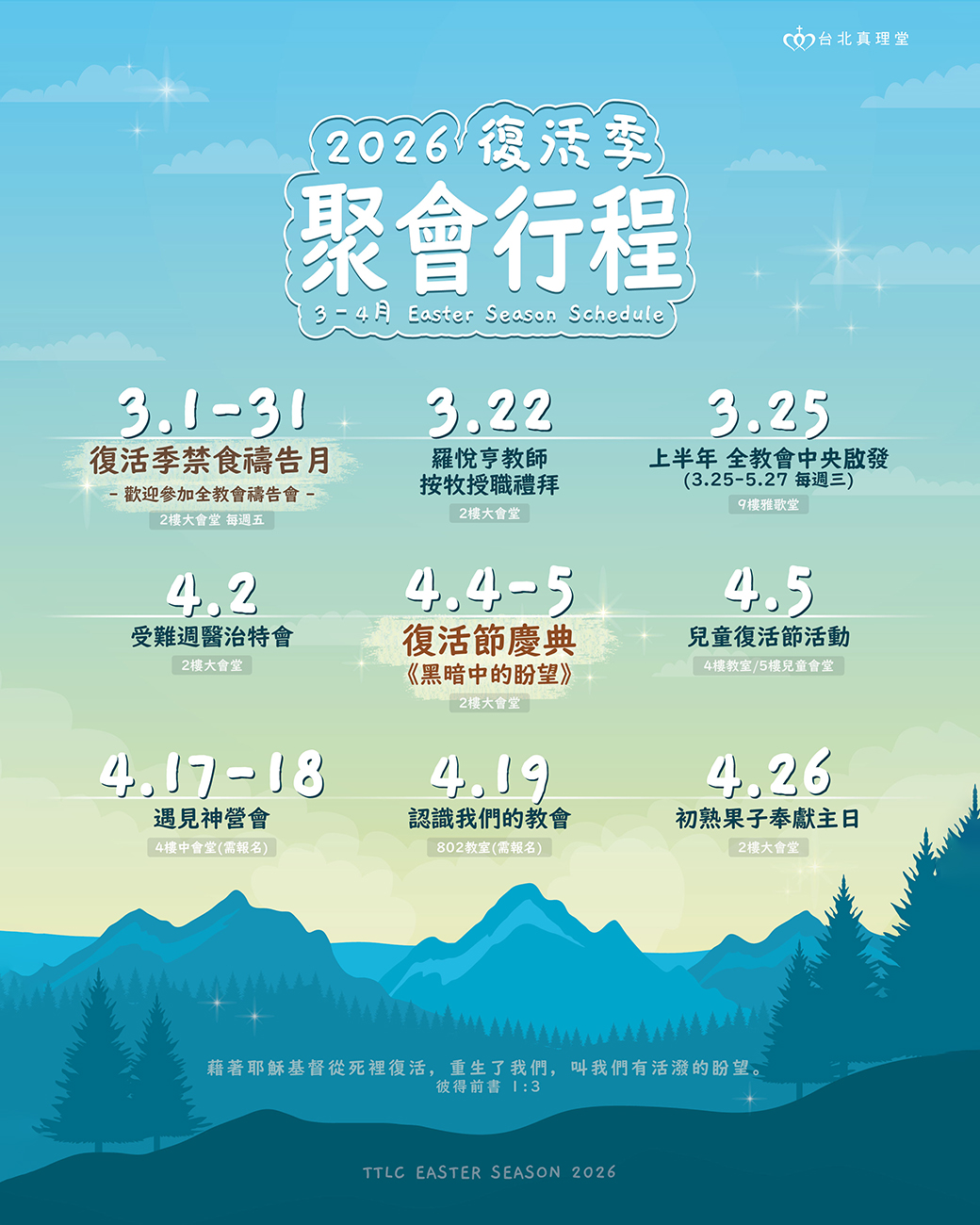 在春暖花開的季節,我們邀請您一同進入「復活」的喜樂。無論您是想在禱告中尋求突破、在特會中領受醫治,或是帶著孩子一同歡慶基督的救恩,這份行程表都為您與家人預備了專屬的空間。