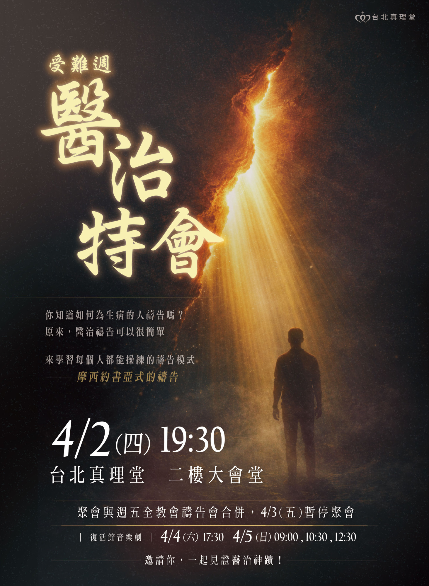 本次醫治特會將與【週五全教會禱告會合併舉辦】,原 4/3 (五) 的聚會暫停一次,請弟兄姊妹留意時間。