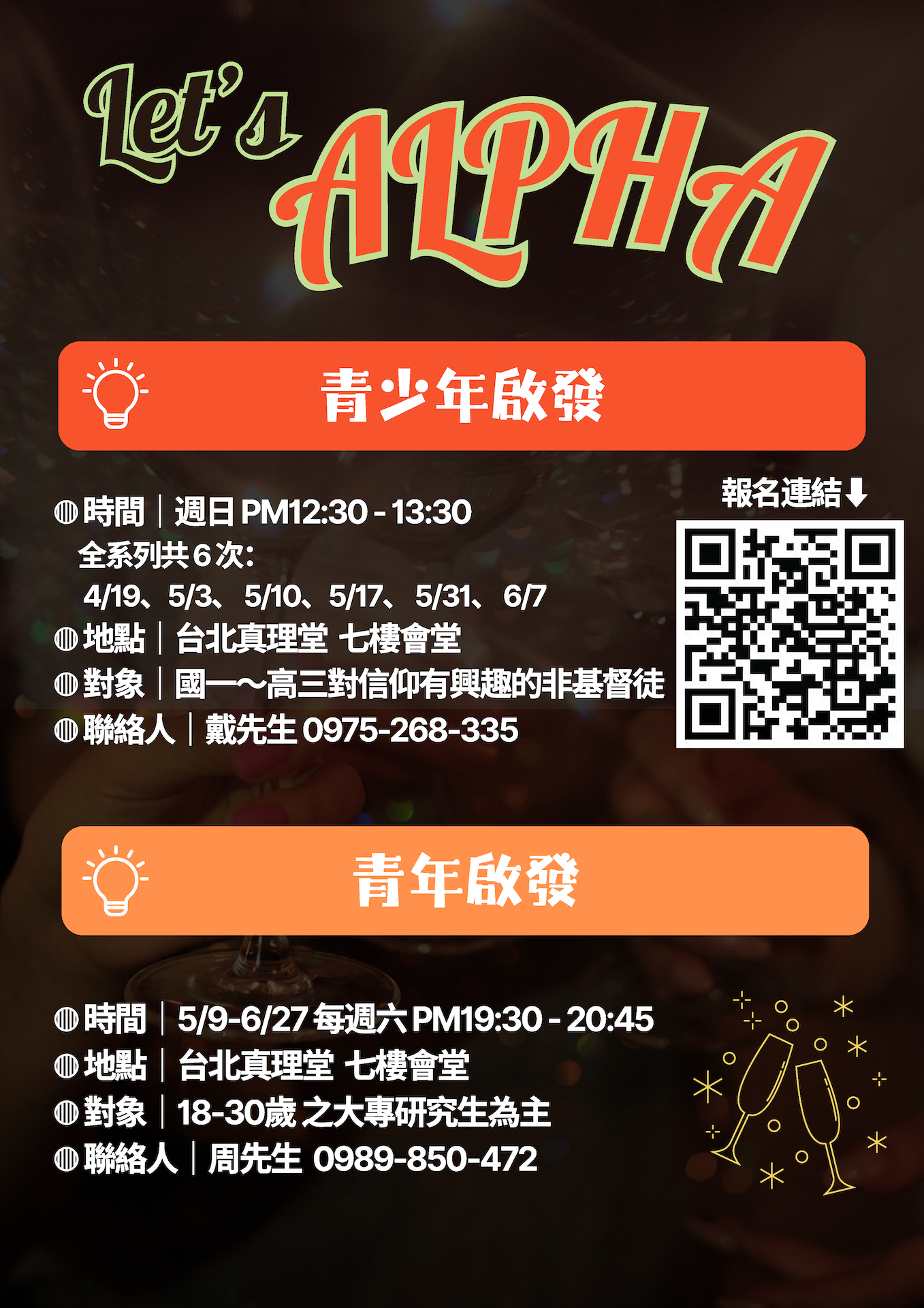 台北真理堂為不同年齡層的你準備了專屬的「啟發課程」。無論你是國高中生,還是大專生、研究生,都歡迎你帶著輕鬆的心情來參加。這是一個沒有壓力、歡迎發問的空間,讓我們一起 Let's ALPHA!