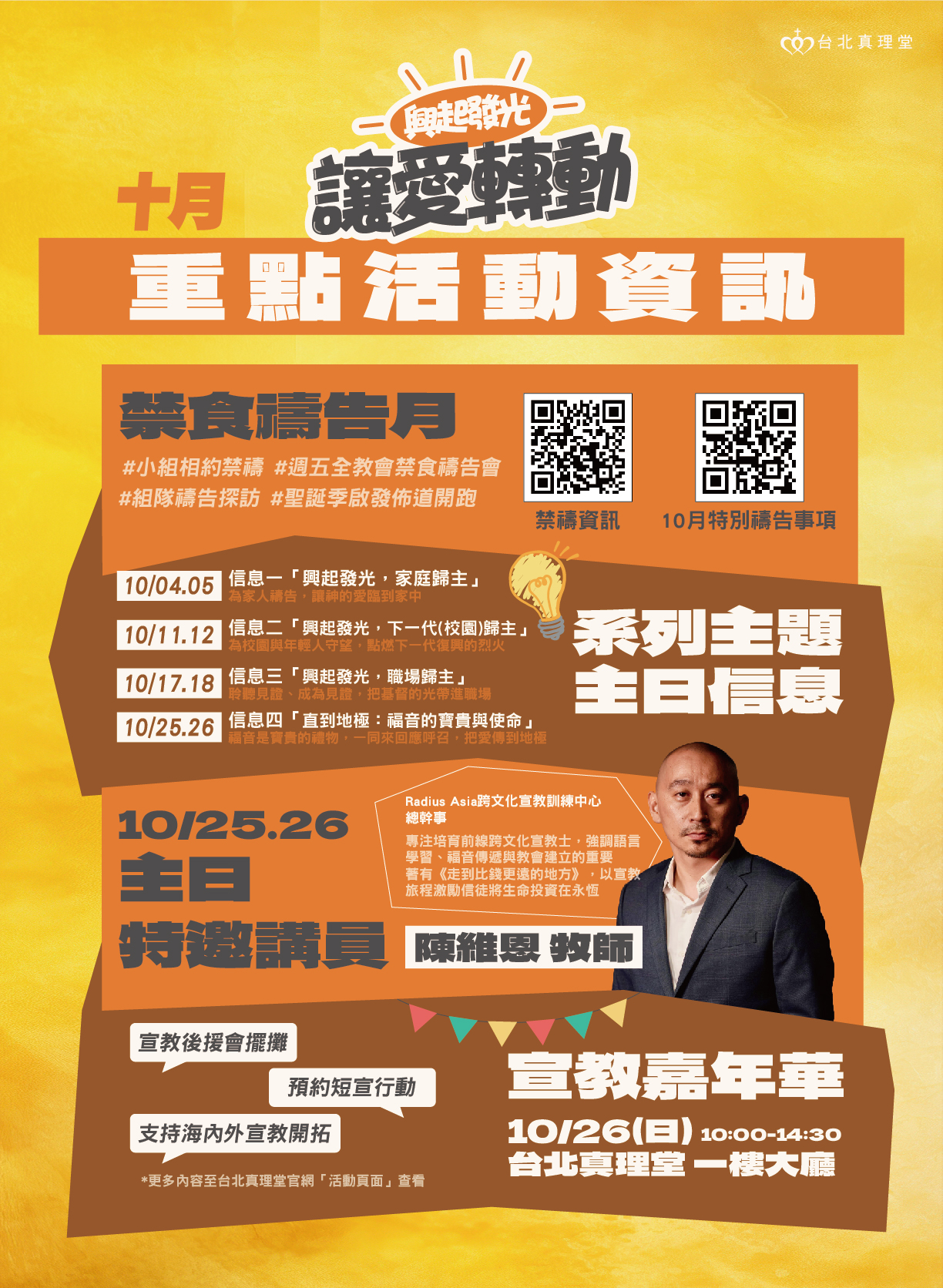 🔹 宣教嘉年華 📅 10/26(日)10:00–14:30 📍 台北真理堂 一樓大廳 一場充滿交流、見證、行動的嘉年華,邀請弟兄姊妹一起參與,實際支持宣教。